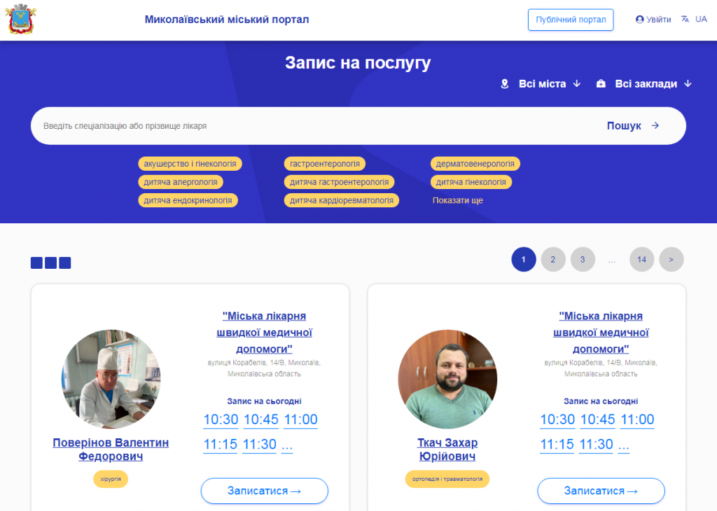 Сьогодні, 25 жовтня, відкрито Миколаївський міський медичний портал, на якому мешканці міста мають можливість записатися на прийом до лікарів вторинної ланки  медичних закладів міста Миколаєва через електронний інтерфейс. За допомогою порталу миколаївці можуть записатися на прийом до вузьких спеціалістів закладів охорони здоров’я м. Миколаєва. Портал розташований за посиланням – med.mkrada.gov.ua . Запис до центрів первинної медико-санітарної допомоги, а саме сімейних лікарів, терапевтів та педіатрів здійснюється через сервіс «Поліклініка без черг» – https://pb4.com.ua/clinic-cat/mikolayiv.